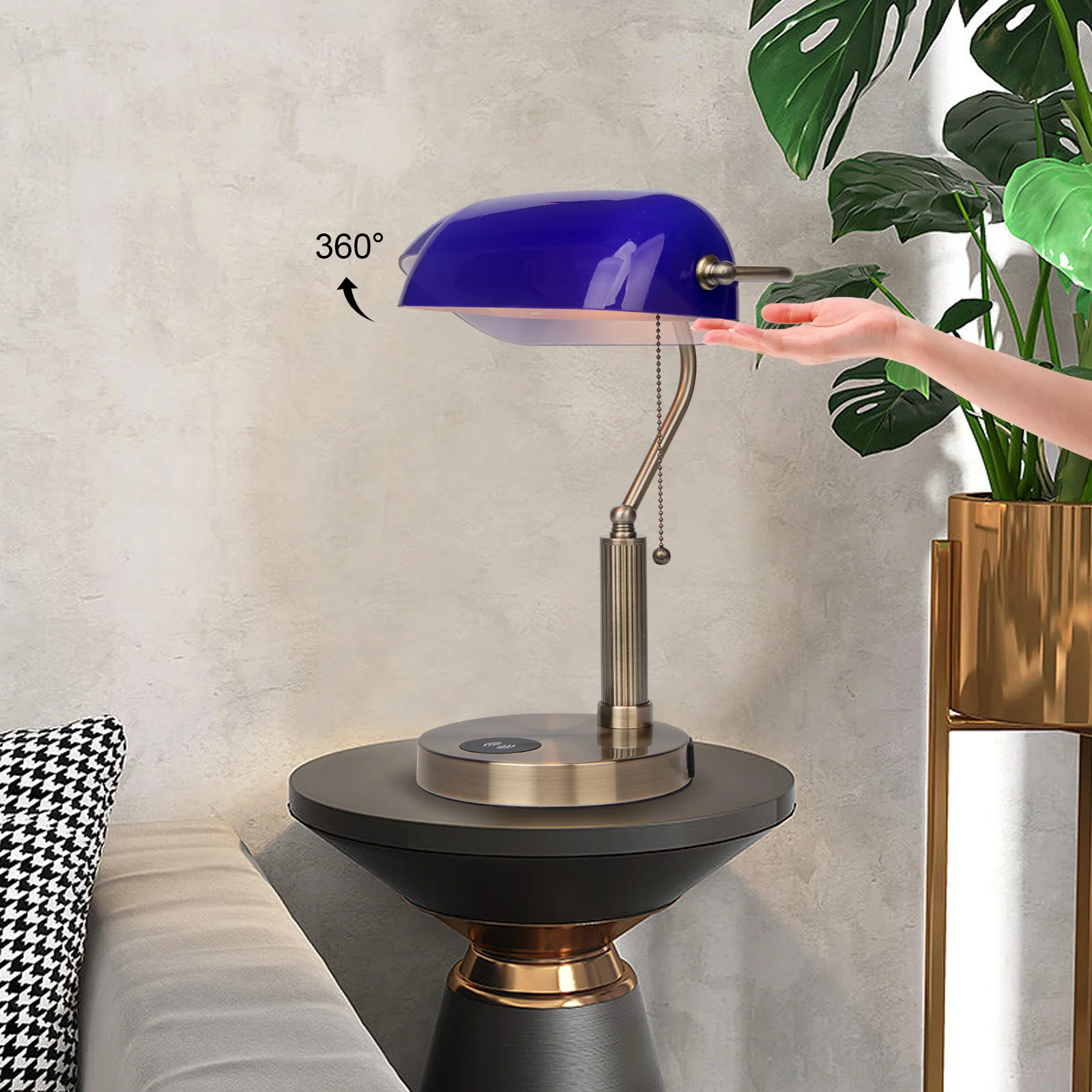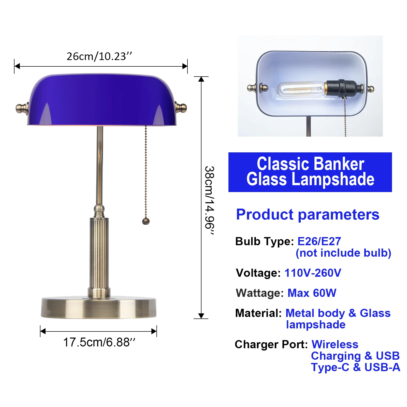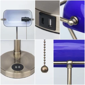 FIRVRE Banker Desk Lamp — Emerald Blue Glass Shade with Wireless Charger, USB Port & Vintage Chain Switch
