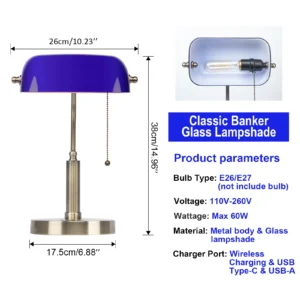 Elevate your workspace with the FIRVRE Banker Desk Lamp — a sophisticated blend of vintage charm and modern convenience. The iconic emerald blue glass shade, polished to a smooth, lustrous finish, sits atop a rust-proof metal base equipped with a built-in wireless charging pad and USB port — keeping your devices powered without the cable clutter.